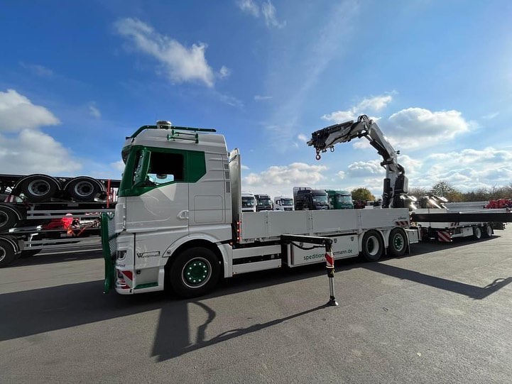 Seit November 2022 ist im Team Schwerlast auch ein MAN TGX TG3 26.510 mit Fassi 545 RA.2.25 Ladekran und passendem Anhänger vertreten. Mit diesem können wir alles, was auf die Ladefläche passt, transportieren. Eine 3m Dauergenehmigung für Deutschland ist vorhanden, somit können wir auf unserem Containerpritschen Fahrgestell und Anhänger auch Ihre 3m breiten Container, Kisten, Kranteile oder Maschinen, sowie Maschinenteile problemlos transportieren. Unser Kran ist in der Lage auf 14,2m Auslage, noch 3,08t unkompliziert zu heben.